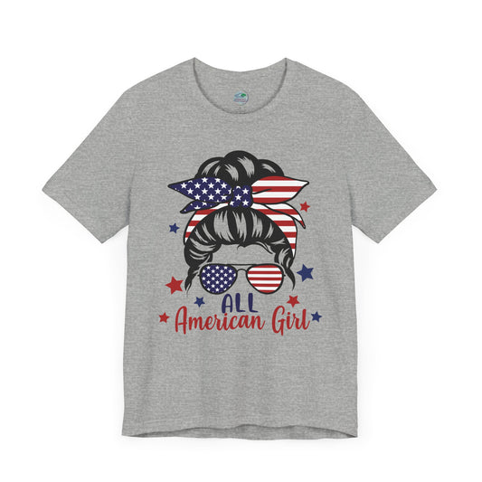 All American Girl | Messy Bun | July 4th | Independence Day | Flag | Adult Jersey Short Sleeve Tee
